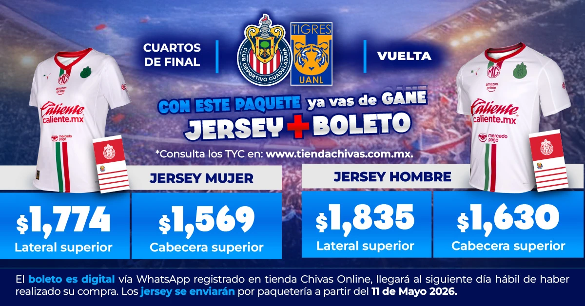 Quick view View Options COMBO JERSEY VISITA RÉPLICA HOMBRE Y BOLETO 4TOS. CABECERA SUPERIOR $1,630.00 Chivas